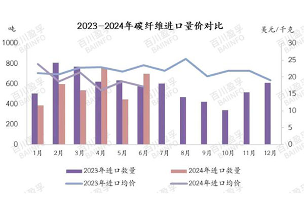2024年6月,碳纖維國內市場價格區間盤整,原料丙烯腈市場價格走低,碳纖維企業成本壓力減小,報價暫維持穩定;供應端,內蒙光威4000噸碳纖維新項目投產,市場整體供應量增加;需求端,下游采購仍偏謹慎,小單入市詢盤采購為主,追求低價。進出口方面,6月我國碳纖維、碳纖維預浸料、其他碳纖維制品進口數量環比增加,碳纖維織物進口數量環比減少。