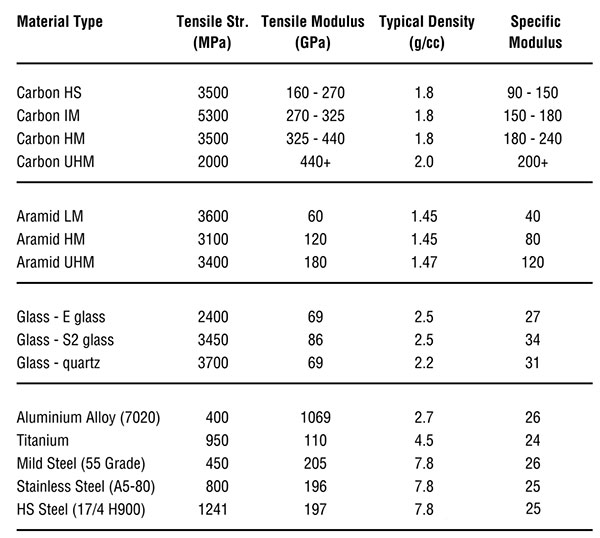 通過下表我們可以了解到最常用增強纖維的基本力學性能以及常見金屬材料的性能對比。