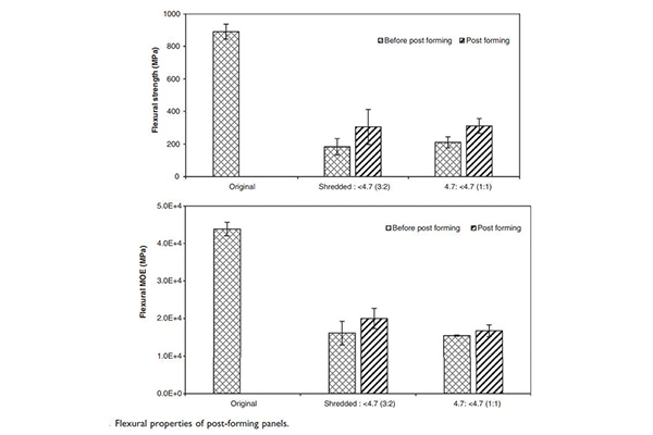 我們在看到整個的研究數據中,明顯能夠看到隨著顆粒尺寸減小,復合材料的力學性能得到提升,最優的粉碎粒度條件為390°C和16分鐘。后續在對回收后的材料進行應用,制造出平面板材等后熱成型處理,通過這樣的方式,從而很好的完成該材料在應用后再次回收應用的閉合循環利用和實際零件或組件制造的可能性,證實了該回收過程及產品的巨大潛力。
